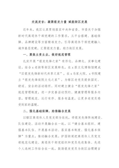 / 【七哥公文】2024年:交流发言:凝聚银发力量 赋能街区发展+更多免费公文+VX:QiGeGongWen2024