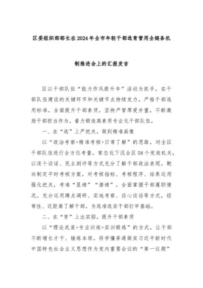 【七哥公文】2024年:区委组织部部长在2024年全市年轻干部选育管用全链条机制推进会上的汇报发言+更多免费公文+VX:QiGeGongWen2024