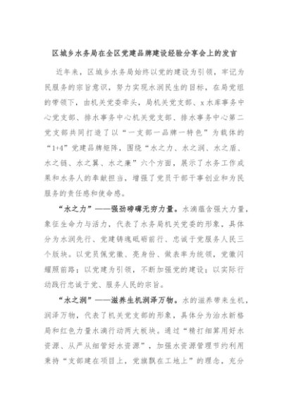 / 【七哥公文】2024年:区城乡水务局在全区党建品牌建设经验分享会上的发言+更多免费公文+VX:QiGeGongWen2024