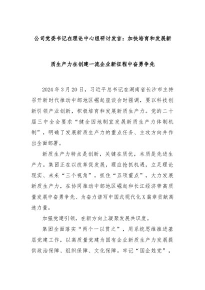 【七哥公文】2024年:公司党委书记在理论中心组研讨发言:加快培育和发展新质生产力在创建一流企业新征程中奋勇争先+更多免费公文+VX:QiGeGongWen2024