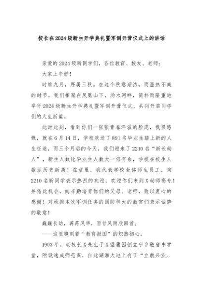【七哥公文】2024年:校长在2024级新生开学典礼暨军训开营仪式上的讲话+更多免费公文+VX:QiGeGongWen2024