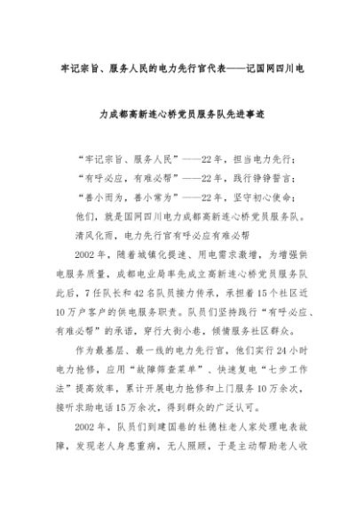 【七哥公文】2024年:牢记宗旨、服务人民的电力先行官代表——记国网四川电力成都高新连心桥党员服务队先进事迹+更多免费公文+VX:QiGeGongWen2024