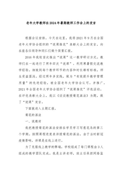 【七哥公文】2024年:老年大学教师在2024年暑期教师工作会上的发言+更多免费公文+VX:QiGeGongWen2024