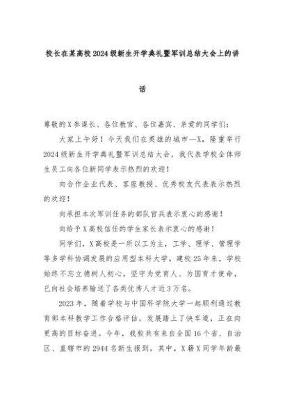 【七哥公文】2024年:校长在某高校2024级新生开学典礼暨军训总结大会上的讲话+更多免费公文+VX:QiGeGongWen2024
