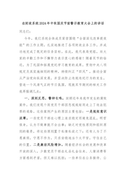 【七哥公文】2024年:在财政系统2024年中秋国庆节前警示教育大会上的讲话+更多免费公文+VX:QiGeGongWen2024