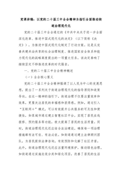 【七哥公文】2024年:党课讲稿:以党的二十届三中全会精神为指引全面推动街道治理现代化+更多免费公文+VX:QiGeGongWen2024