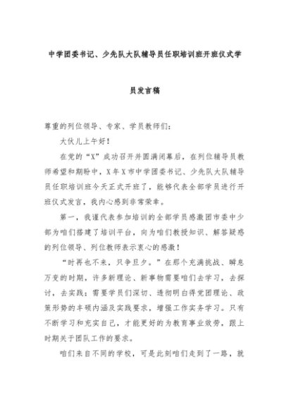 【七哥公文】2024年:中学团委书记、少先队大队辅导员任职培训班开班仪式学员发言稿+更多免费公文+VX:QiGeGongWen2024