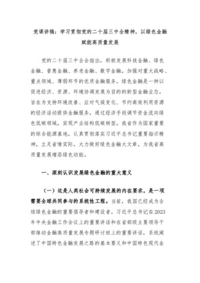 【七哥公文】2024年:党课讲稿:学习贯彻党的二十届三中全精神,以绿色金融赋能高质量发展+更多免费公文+VX:QiGeGongWen2024