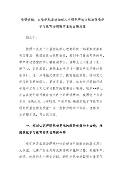 【七哥公文】2024年:党课讲稿:自觉学纪准确知纪心中明纪严格守纪确保党纪学习教育全程高质量全面高质量+更多免费公文+VX:QiGeGongWen2024