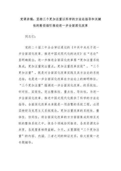 【七哥公文】2024年:党课讲稿:坚持三个更加注重以科学的方法论指导和关键性的路径指引推动进一步全面深化改革+更多免费公文+VX:QiGeGongWen2024