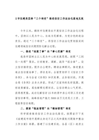 【七哥公文】2024年:X市住建局坚持“三个转变”推进信访工作法治化落地见效+更多免费公文+VX:QiGeGongWen2024