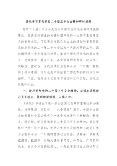 【七哥公文】2024年:县长学习贯彻党的二十届三中全会精神研讨材料 (1)+更多免费公文+VX:QiGeGongWen2024