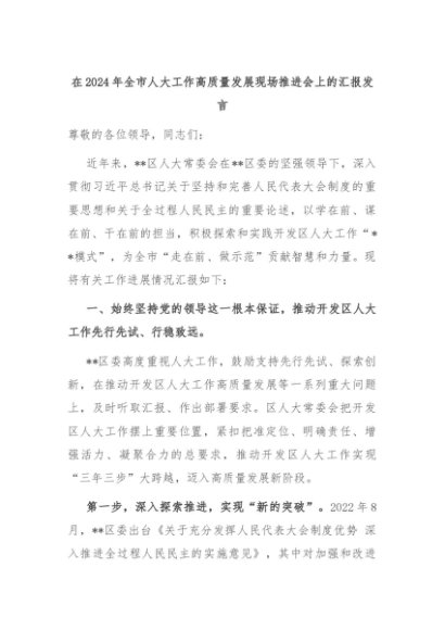 【七哥公文】2024年:在2024年全市人大工作高质量发展现场推进会上的汇报发言+更多免费公文+VX:QiGeGongWen2024