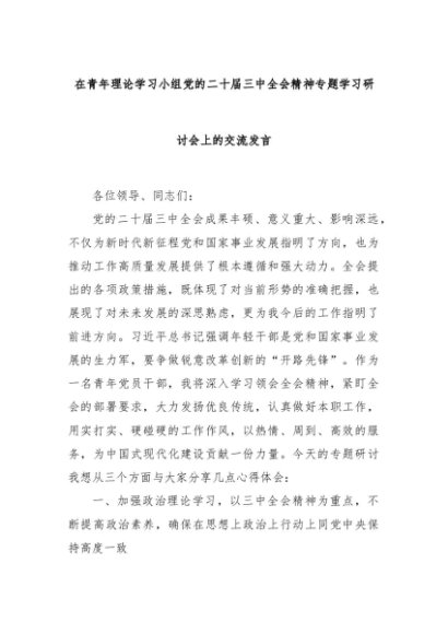 【七哥公文】2024年:在青年理论学习小组党的二十届三中全会精神专题学习研讨会上的交流发言 (1)+更多免费公文+VX:QiGeGongWen2024