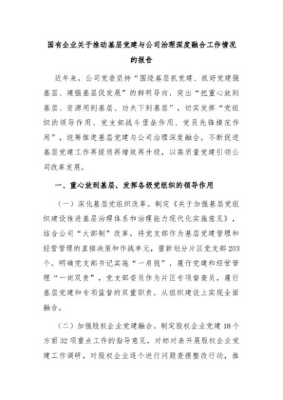 【七哥公文】2024年:国有企业关于推动基层党建与公司治理深度融合工作情况的报告+更多免费公文+VX:QiGeGongWen2024