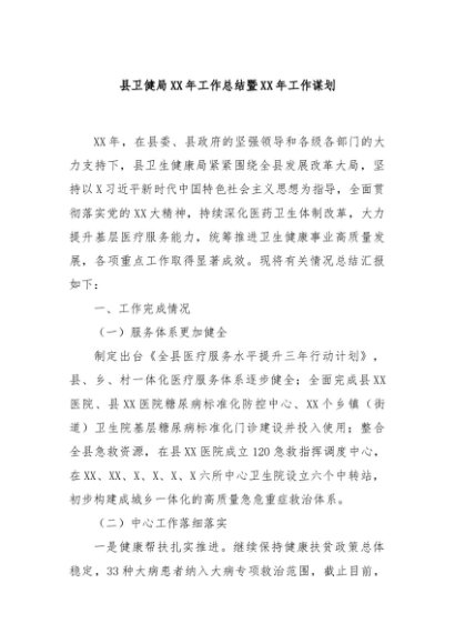 / 【七哥公文】2024年:县卫健局XX年工作总结暨XX年工作谋划+更多免费公文+VX:QiGeGongWen2024