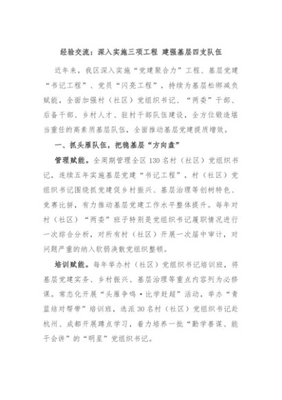 / 【七哥公文】2024年:经验交流:深入实施三项工程 建强基层四支队伍+更多免费公文+VX:QiGeGongWen2024