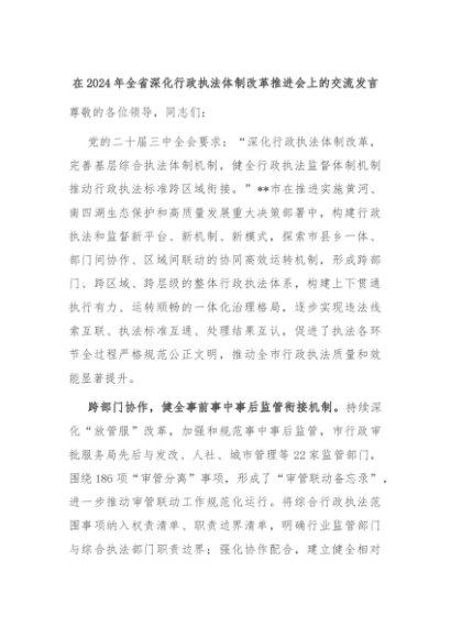 【七哥公文】2024年:在2024年全省深化行政执法体制改革推进会上的交流发言+更多免费公文+VX:QiGeGongWen2024