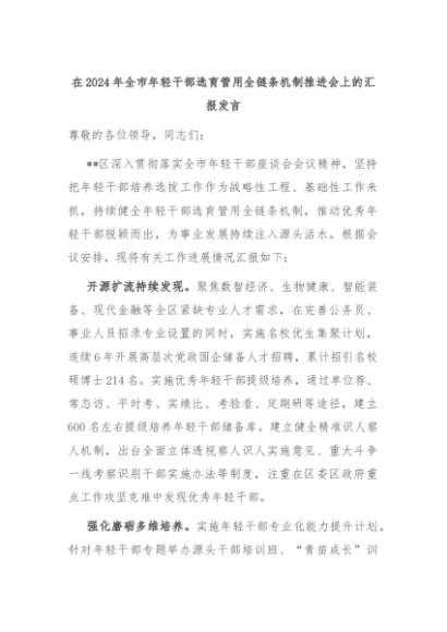 【七哥公文】2024年:在2024年全市年轻干部选育管用全链条机制推进会上的汇报发言+更多免费公文+VX:QiGeGongWen2024