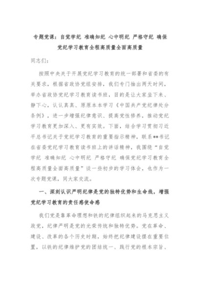 【七哥公文】2024年:专题党课:自觉学纪 准确知纪 心中明纪 严格守纪 确保党纪学习教育全程高质量全面高质量+更多免费公文+VX:QiGeGongWen2024