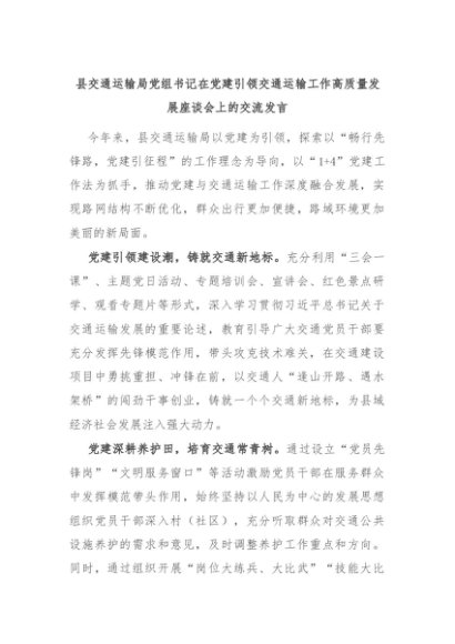 【七哥公文】2024年:县交通运输局党组书记在党建引领交通运输工作高质量发展座谈会上的交流发言+更多免费公文+VX:QiGeGongWen2024