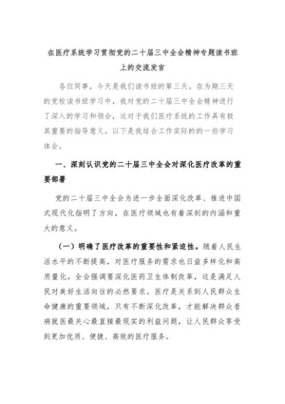 【七哥公文】2024年:在医疗系统学习贯彻党的二十届三中全会精神专题读书班上的交流发言+更多免费公文+VX:QiGeGongWen2024