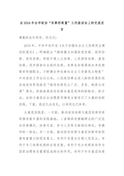 【七哥公文】2024年:在2024年全市政协“有事好商量”工作座谈会上的交流发言+更多免费公文+VX:QiGeGongWen2024