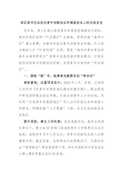 【七哥公文】2024年:团区委书记在优化青年创新创业环境座谈会上的交流发言+更多免费公文+VX:QiGeGongWen2024
