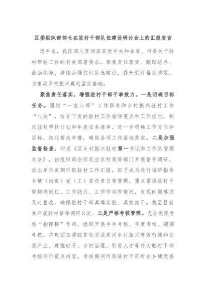 【七哥公文】2024年:区委组织部部长在驻村干部队伍建设研讨会上的汇报发言+更多免费公文+VX:QiGeGongWen2024