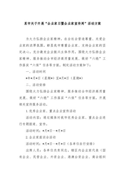 / 【七哥公文】2024年:某市关于开展“企业家日暨企业家宣传周”活动方案+更多免费公文+VX:QiGeGongWen2024