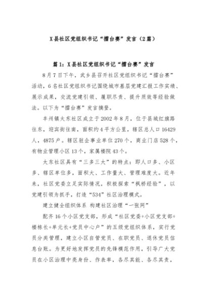/ 【七哥公文】2024年:(2篇)X县社区党组织书记“擂台赛”发言+更多免费公文+VX:QiGeGongWen2024