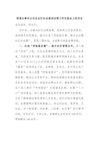 【七哥公文】2024年:街道办事处主任在全区社会基层治理工作交流会上的发言+更多免费公文+VX:QiGeGongWen2024