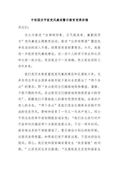 / 【七哥公文】2024年:中秋国庆节前党风廉政警示教育党课讲稿+更多免费公文+VX:QiGeGongWen2024