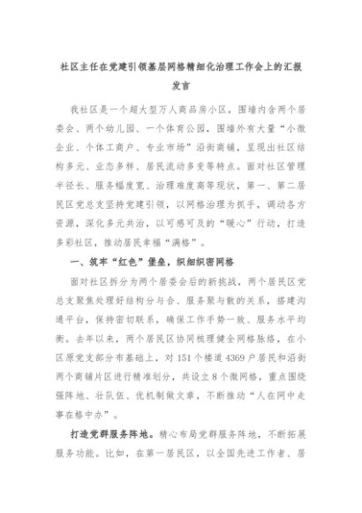 【七哥公文】2024年:社区主任在党建引领基层网格精细化治理工作会上的汇报发言+更多免费公文+VX:QiGeGongWen2024