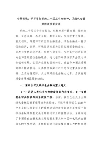 【七哥公文】2024年:专题党课:学习贯彻党的二十届三中全精神,以绿色金融赋能高质量发展+更多免费公文+VX:QiGeGongWen2024