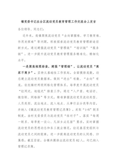 / 【七哥公文】2024年:镇党委书记在全区流动党员教育管理工作交流会上发言+更多免费公文+VX:QiGeGongWen2024