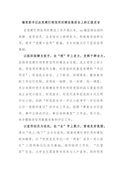 / 【七哥公文】2024年:镇党委书记在党建引领信用村建设推进会上的汇报发言+更多免费公文+VX:QiGeGongWen2024