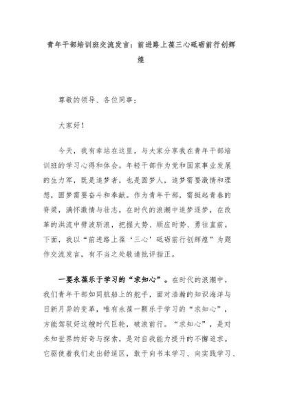 【七哥公文】2024年:青年干部培训班交流发言:前进路上葆三心砥砺前行创辉煌+更多免费公文+VX:QiGeGongWen2024