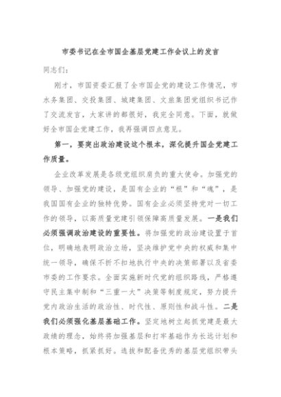 / 【七哥公文】2024年:市委书记在全市国企基层党建工作会议上的发言+更多免费公文+VX:QiGeGongWen2024