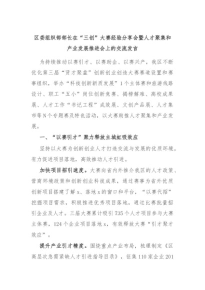【七哥公文】2024年:区委组织部部长在“三创”大赛经验分享会暨人才聚集和产业发展推进会上的交流发言+更多免费公文+VX:QiGeGongWen2024