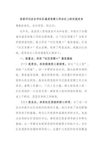 / 【七哥公文】2024年:县委书记在全市社区基层党建工作会议上的交流发言+更多免费公文+VX:QiGeGongWen2024
