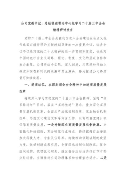 【七哥公文】2024年:公司党委书记、总经理在理论中心组学习二十届三中全会精神研讨发言+更多免费公文+VX:QiGeGongWen2024