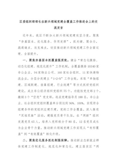 【七哥公文】2024年:区委组织部部长在新兴领域党建全覆盖工作推进会上的交流发言+更多免费公文+VX:QiGeGongWen2024