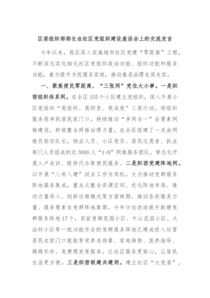 / 【七哥公文】2024年:区委组织部部长在社区党组织建设座谈会上的交流发言+更多免费公文+VX:QiGeGongWen2024