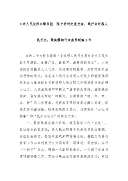 【七哥公文】2024年:X市人民法院D组书记、院长研讨交流发言:践行全过程人民民主,做实做细代表委员联络工作+更多免费公文+VX:QiGeGongWen2024