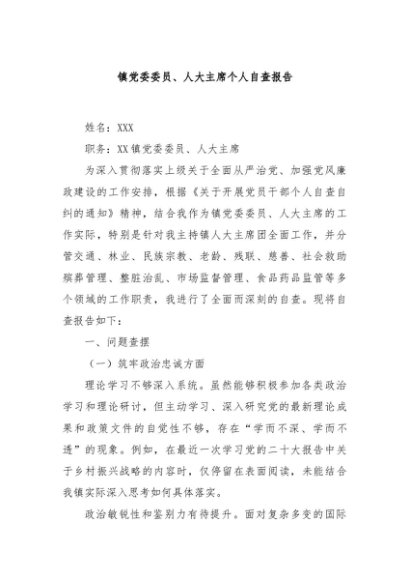 / 【七哥公文】2024年:镇党委委员、人大主席个人自查报告+更多免费公文+VX:QiGeGongWen2024