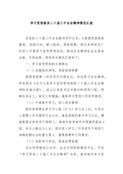 / 【七哥公文】2024年:学习贯彻落实二十届三中全会精神情况汇报+更多免费公文+VX:QiGeGongWen2024