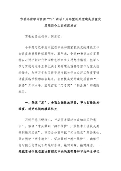 【七哥公文】2024年:市委办在学习贯彻“79”讲话五周年暨机关党建高质量发展座谈会上的交流发言+更多免费公文+VX:QiGeGongWen2024