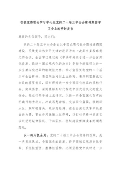 【七哥公文】2024年:在校党委理论学习中心组党的二十届三中全会精神集体学习会上的研讨发言+更多免费公文+VX:QiGeGongWen2024