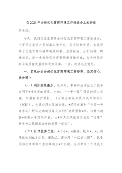 / 【七哥公文】2024年:在2024年全州优化营商环境工作推进会上的讲话+更多免费公文+VX:QiGeGongWen2024